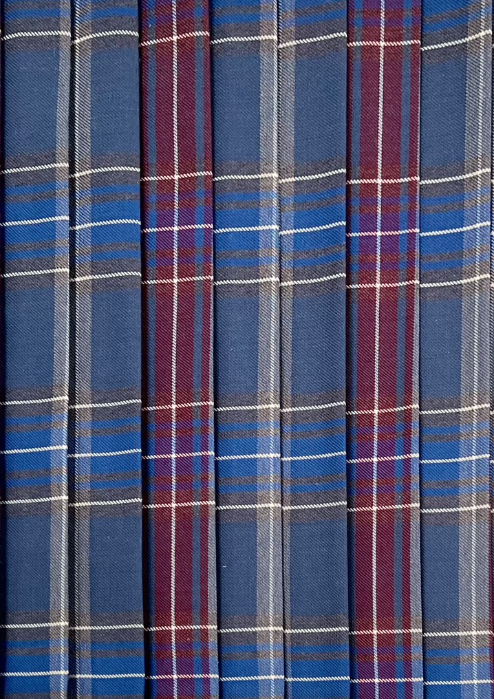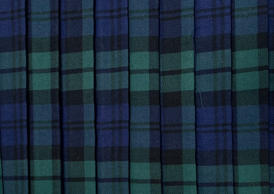 Aquí se aprecian distintos tipos de plisado en telas estampadas. Los cuadros escoceses y príncipe de gales son perfectos para faldas escolares, garantizando resistencia, movimiento cómodo y una estética elegante y tradicional.